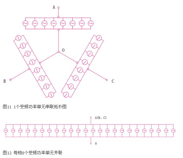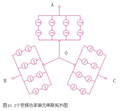 圖10所示的是1/4全電壓等級3.3kv的拓撲圖:由2個變頻功率單元串聯(lián)組成1個變流鏈,每相由4個變流鏈相并聯(lián),實現(xiàn)3.3kv等級的三相交流恒功率5000kva輸出。