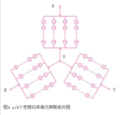 1/4全電壓等級如圖4所示,由n/4個變頻功率單元串聯(lián)組成1個變流鏈,每相由4個變流鏈相并聯(lián),實現(xiàn)1/4全電壓等級的三相交流恒功率輸出,其中n為偶數(shù)。