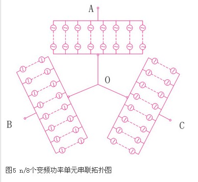 1/8全電壓等級如圖5所示,由n/8個變頻功率單元串聯(lián)組成1個變流鏈,每相由8個變流鏈相并聯(lián),實現(xiàn)1/8全電壓等級的三相交流恒功率輸出,其中n為偶數(shù)。