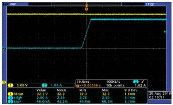 圖4 示波器屏幕顯示了當負載電流從0A變至2.8A時,吉時利2200-32-3的輸出電壓調(diào)節(jié)。在整個變化過程中,輸出電壓保持穩(wěn)定