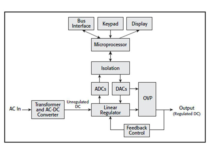 歷史上,直流電源用戶使用電位計設(shè)置輸出電壓或電流。今天,微處理器從用戶接口或遠端接口接收輸入。數(shù)模轉(zhuǎn)換器(DAC)接收數(shù)字設(shè)置,將其轉(zhuǎn)換為模擬值并用作模擬調(diào)節(jié)器的參考。設(shè)置分辨率和準確度的值由轉(zhuǎn)換質(zhì)量和調(diào)節(jié)過程決定。