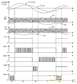 新穎的Buck-Boost型正弦交流穩(wěn)壓器,采用具有輸入電壓極性和工作模式選擇的電壓瞬時(shí)值反饋控制方案,其感性負(fù)載時(shí)的原理波形如圖3所示。圖中 iL21為高頻儲(chǔ)能式變壓器的副邊電感電流iL2的基波分量。通過調(diào)節(jié)PWM信號(hào)的占空比,即可實(shí)現(xiàn)正弦交流穩(wěn)壓器輸出電壓的穩(wěn)定。輸出濾波電容與負(fù)載的 并聯(lián)阻抗等效為感性、容性、阻性時(shí),正弦交流穩(wěn)壓器的工作模式順序分別為A-B-C-D、D-C-B-A、A-C。