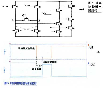 因前置放大器的增益與輸入電壓的乘積不足以達到輸出VOH的要求,所以把放大后的電壓再加到鎖存器上即可以得到所要求的電壓。第三級比較器的結構采用可再生比較器,它也是使用正反饋來實現(xiàn)兩個信號的比較??稍偕容^器又稱為鎖存比較器。比較器中兩相非交疊時鐘控制,確定不同的工作模式,從而實現(xiàn)比較器的復位與輸出。其電路的拓撲結構如圖4所示。其中兩相非交疊時鐘Q1和Q2的波形如圖5所示。