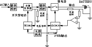 本文所介紹的充電器其充電對象為24V鉛酸蓄電池,輸入電壓范圍為交流100~240V,28V輸出時額定輸出電流為4A。該充電器電路由三部分組成,主電路、PWM芯片UC3842控制電路、單片機S3C9454控制電路,整體電路結構如圖2所示。由于該充電器功率為100W左右,故功率部分采用成本較低的單端反激電路,利用UC3842作為主電路控制IC。輸出端繼電器僅在單片機檢測符合充電條件后閉合,充電器才能對電池進行充電。