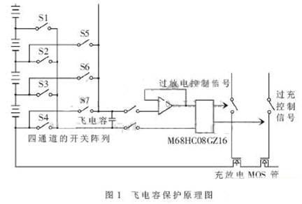 對(duì)于單體電池的檢測(cè),主要采用飛電容技術(shù)。飛電容技術(shù)的原理圖如圖1所示,為電池組后4節(jié)的保護(hù)電路圖,通過四通道的開關(guān)陣列可以將后4節(jié)電池的任意1節(jié)電池的電壓采集到單片機(jī)中,單片機(jī)輸出驅(qū)動(dòng)信號(hào),控制MOS管的導(dǎo)通和關(guān)斷,從而對(duì)電池組的充電放電起到保護(hù)作用。
