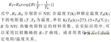 采用熱敏電阻作為溫度傳感器進(jìn)行溫度采樣。熱敏電阻是一種熱敏性半導(dǎo)體電阻器,其電阻值隨著溫度的升高而下降。電阻溫度特性可以近似地用下式來表示:
