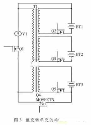 電池組常用的均衡方法有分流法、飛速電容均衡充電法、電感能量傳遞方法等。在本系統(tǒng)中,需要較多的I/O口驅(qū)動(dòng)開關(guān)管,而單片機(jī)的I/O口有限,所以采取整充轉(zhuǎn)單充的充電均衡方法。原理圖如圖3所示。Q4是控制電池組整充的開關(guān),Q2、Q3、Q5是控制單節(jié)電池充電的開關(guān)。以10節(jié)錳酸鋰電池組為例,變壓器主線圈兩端電壓為42 V,副線圈電壓為電池的額定電壓4.2 V。剛開始Q4導(dǎo)通,Q2、Q3、Q5截止,單節(jié)電池的電壓不斷升高,當(dāng)檢測(cè)到某一節(jié)電池的電壓達(dá)到額定電壓4.2 V以后,電壓檢測(cè)芯片發(fā)出驅(qū)動(dòng)信號(hào),關(guān)閉Q4,打開Q2、Q3、Q5,整個(gè)系統(tǒng)進(jìn)入單充階段,未充滿的電池繼續(xù)充電,以達(dá)到額定電壓的電池保持額定電壓不變。經(jīng)測(cè)試,電壓差值不會(huì)超過50 mV。
