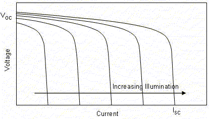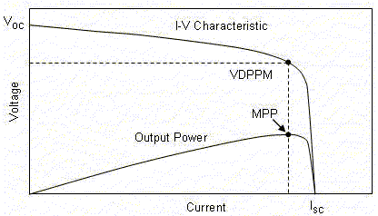 在大多數(shù)應用中,人們期望從太陽能電池獲取盡可能多的功率。因為輸出功率是輸出電壓和電流的乘積,有必要確定電池的哪一部分的工作區(qū)域產(chǎn)生的輸出電壓和電流的乘積的數(shù)值最大,這一點被稱為最大功率點(MPP)。在一種極端情況下,輸出電壓為其最大數(shù)值(VOC),但是,輸出電流為零;在其它極端情況下,輸出電流位其最大值(ISC),但是,輸出電壓為零。在兩種情況下,輸出電壓和電流的乘積都是零。因此,MPP必須位于兩種極端情況之間的某處。