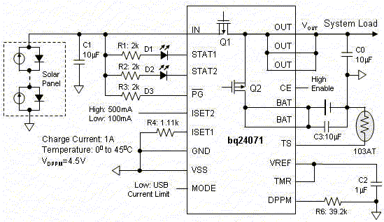 從這個太陽能板獲得的最大輸出電壓(VOC)通常在5.5V到6V之間。因為該電壓低于預設的6V輸出調(diào)節(jié)電壓,MOSFET Q1被完全關(guān)閉。如果系統(tǒng)和電池充電器所需要的總電流超過太陽能電池的輸出電流—取決于光線強弱—能力,太陽能板的輸出電壓將下跌,從而使輸出電壓(VOUT)下降。當VOUT下降到VDPPM—也是太陽能板的輸出電壓—的時候,充電電流就下降了。太陽能板現(xiàn)在將在接近其MPP的狀態(tài)下工作,如果VDPPM被設置為接近MPP的話。通過恰當?shù)匕裄DPPM編程到一個電平,就容許VOUT保持在最小的4.5V,從而實現(xiàn)這一點。這個VDPPM數(shù)值就被人們所采用,因為它相當符合太陽能板的MPP。