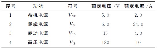 但本文設(shè)計(jì)的電源只為顯示系統(tǒng)提供大功率180V高壓和+5V 邏輯電壓及+15V 驅(qū)動(dòng)電壓。顯示屏需要的其他高壓又每塊顯示屏的控制電路產(chǎn)生。表1為各種輸出電壓及負(fù)載能力表。