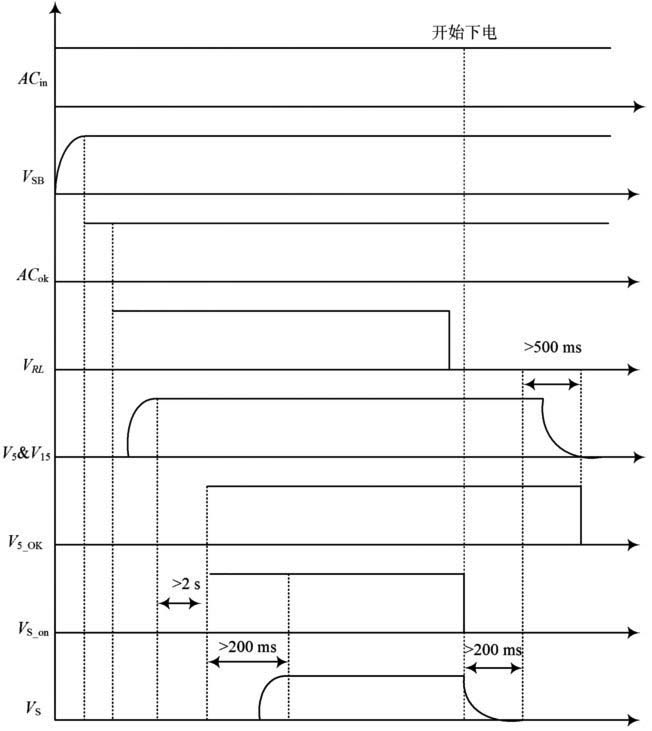 PDP電源在工作時(shí),具有嚴(yán)格的開機(jī)時(shí)序和關(guān)機(jī)時(shí)序。當(dāng)插上整機(jī)電源插頭后,輸出待機(jī)電源VSB,同時(shí)交流信號(hào)檢測(cè)ACOK=1.此時(shí)按下開關(guān)。數(shù)字電路CPU向電源發(fā)出電源控制信號(hào),使VRL =1,電源向各種邏輯電路、控制電路、保護(hù)電路提供+5V,+15V電源,然后將V5_ok置1.當(dāng)電源檢測(cè)信號(hào)V5_ok=1時(shí),數(shù)字電路CPU向電源發(fā)出VS_on=1.PDP電源向顯示系統(tǒng)提供180V高壓。關(guān)機(jī)時(shí),先關(guān)掉高壓電源,然后再關(guān)掉+5 V,+15 V 電壓。工作時(shí)序如圖2所示。