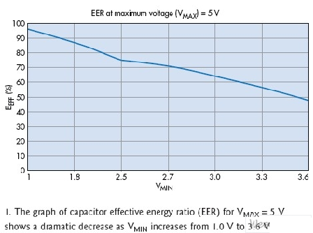 從設(shè)計(jì)角度看,超級電容和電池的根本區(qū)別在于電容器在充/放電周期發(fā)生的顯著電壓變化。充電時(shí),理論上,電容器的電壓從零上升到其最高額定電壓,而電池的端電壓在其工作周期中變化很小。超級電容是電子電容器的一個(gè)子集??赏ㄟ^下式得出能從超級電容放電周期中(放電周期是指電容器的端電壓從其最大值VMAX變?yōu)樽畹凸ぷ麟妷篤MIN的過程)獲得的有效能量EEFF: