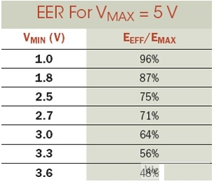 其中EMAX代表電容器存儲的總能量。等式2明確表明,隨著我們通過減少電容器內(nèi)的駐留電能,而降低了被供電電路的最低工作電壓VMIN,有效能效比可獲得極大地提升。對任何以電容供電的電路來說,能效比都是一個(gè)非常重要的設(shè)計(jì)考慮?! ?br />