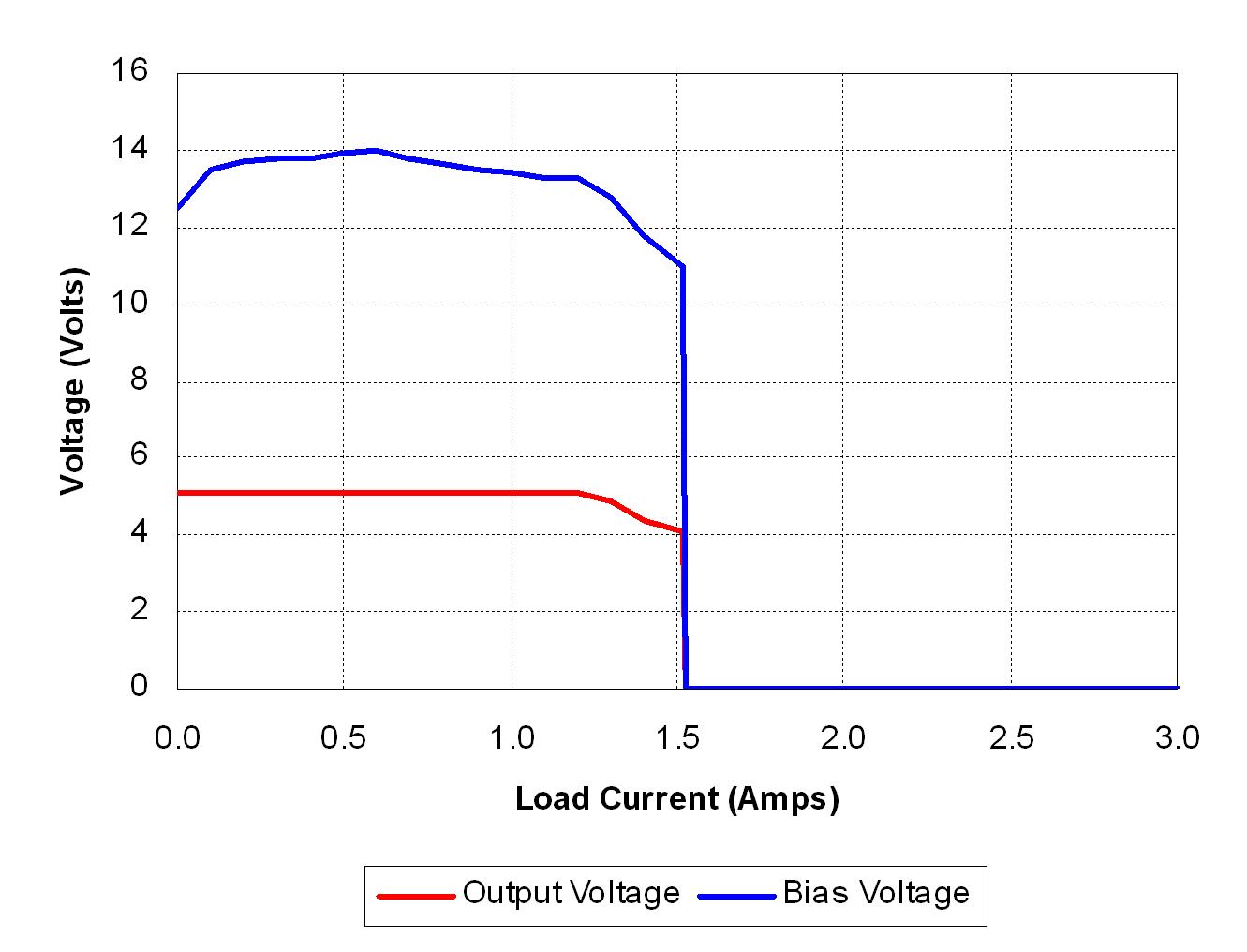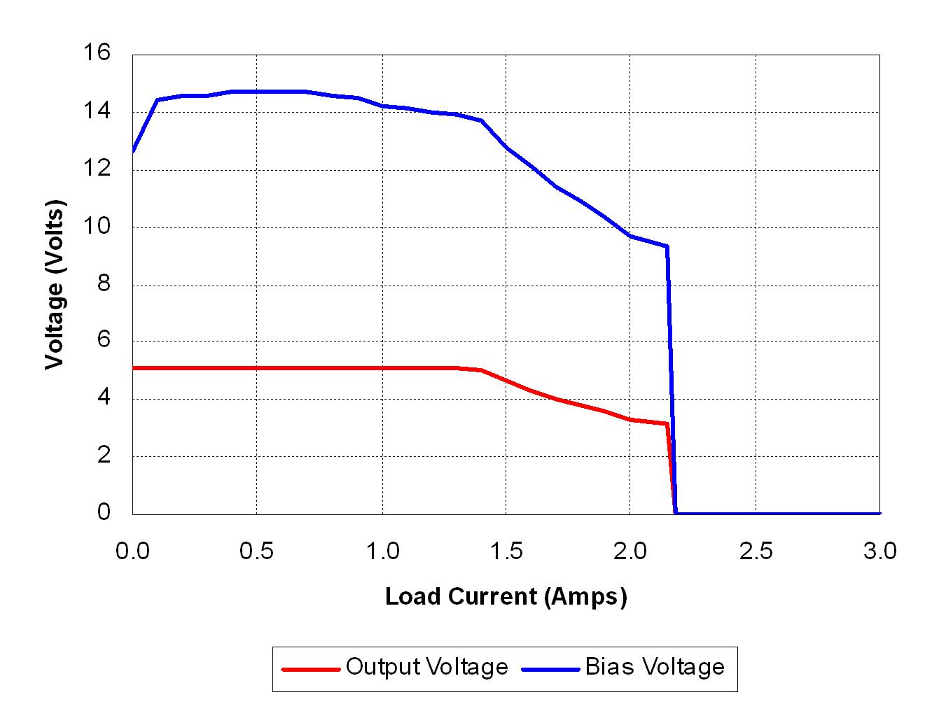 圖3顯示了輸出和偏置電壓與圖2所示電路負載電流的對比情況。輸出V-I特性非常接近于圖1所示理想情況。負載電流達到約1.3A時開始功率限制。隨著負載增加,輸出電壓開始下降。由于偏置電壓是輸出電壓的反映,因此它也開始下降。偏置電壓降至9V關(guān)閉水平以下時,PWM控制器關(guān)閉。