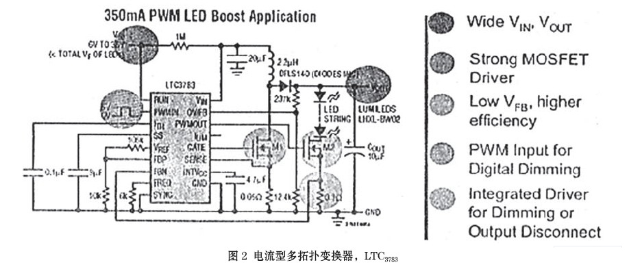 LTC3783是帶恒流PWM調(diào)光的電流型多拓撲變換器(圖2),用于驅(qū)動大功率LED燈串。本項專利技術(shù)可提供非??於鴾蚀_的負載切換,不會產(chǎn)生瞬時的欠電壓或過電壓,能數(shù)字式達到3000∶1的調(diào)光率(100Hz),純色的PWM調(diào)光可確保白色LED和紅綠藍(RGB) LED的顏色完整性。LTC3783利用模擬控制,容許附加100∶1的調(diào)光比,因人眼對周圍光線的變化很敏感,故這一比率必不可少。該多功能的控制器可用于升壓、降壓、升降壓雙向變換器或反激式(Flyback)變換器,或作為恒流/恒壓的調(diào)節(jié)器。利用MOSFET的通態(tài)電阻(on-resistance)可取消傳感電流的電阻器,并提高了效率。LTC3783芯片的應用還包括:高電壓LED陣列和LED背光,以及在電訊、自動化與工業(yè)控制系統(tǒng)中的調(diào)節(jié)器。