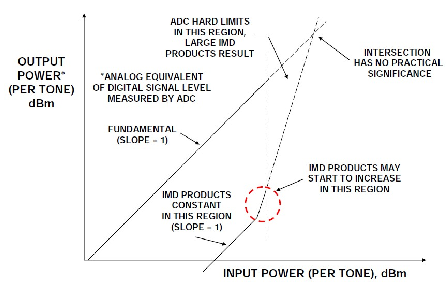 對于給定的頻率,在已知三階交調(diào)截點(diǎn)的情況下,可以計(jì)算出三階IMD積的近似電平值(為輸出信號電平的函數(shù))。