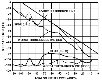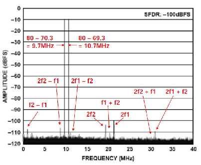 當(dāng)輸入信號處于ADC滿量程范圍的幾dB之內(nèi)時(shí),IMD可能開始增加(但在設(shè)計(jì)優(yōu)良的ADC中可能不會(huì)如此)。出現(xiàn)這種現(xiàn)象的確切電平取決于具體的ADC--有些ADC在其滿量程輸入范圍內(nèi),其IMD積不會(huì)顯著增大,但多數(shù)ADC會(huì)。當(dāng)輸入信號繼續(xù)增加并超過滿量程范圍時(shí),ADC應(yīng)充當(dāng)理想的限幅器,IMD積將變得非常大。出于對此類原因的考慮,ADC并無二階和三階IMD交調(diào)截點(diǎn)額定值。需要注意的是,DAC實(shí)際上存在同樣的情況。在兩種情況下,單音或多音SFDR(無雜散動(dòng)態(tài)范圍)額定值是廣受認(rèn)可的數(shù)據(jù)轉(zhuǎn)換器失真性能的衡量指標(biāo)。