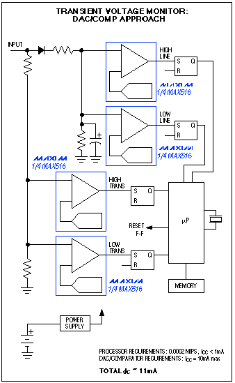 在這種情況下,DAC/比較器替代方案提供了幾個明顯優(yōu)勢。需要4個DAC和4個比較器(或一片MAX516),后面連接一個4路設(shè)置/復(fù)位觸發(fā)器。一組DAC/比較器/FF監(jiān)測高瞬態(tài)電壓,一組監(jiān)測低瞬態(tài)電壓,一組用于監(jiān)測電網(wǎng)跌落,一組用于監(jiān)測浪涌(圖2)。瞬態(tài)電壓直接耦合到比較器,連接到電壓跌落和浪涌監(jiān)測比較器的輸入首先要進(jìn)行整流和濾波,以獲得電網(wǎng)電壓的平均值??稍谲浖姓{(diào)整到合適的rms.