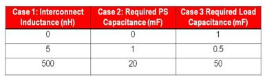 表1對舉例系統(tǒng)三個互連電感的要求電容器進行了比較。通過改變互連電感、計算負載旁路電容并設計電源的相應輸出級和控制環(huán)路,得到比較數據。案例1的負載和電源并列放置;案例2電源和負載之間的互連電感大小為中等。案例3中,使用線纜連接的電源的電感極高。要求旁路的多少直接與互連電感有關。