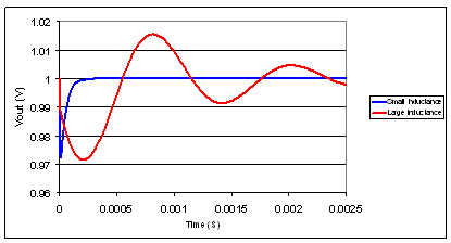 圖 2 對小和大互連電感的負載瞬態(tài)期間的輸出電壓變化模擬情況進行了比較。小電感響應快速漸次減弱,而大電感則并非如此,花費了較長的時間才穩(wěn)定下來。這是由于特性阻抗更高以及諧振頻率更低。另外,如果負載電流在該諧振頻率有規(guī)律地跳動,則會出現極寬且具破壞性的電壓變化。