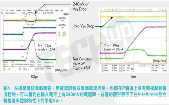 我們應(yīng)該更進一步鉆研的下一代智慧型FET的特性是當(dāng)開關(guān)關(guān)閉時會發(fā)生什么?採用離散P溝道的傳統(tǒng)負(fù)載開關(guān)可以完全關(guān)閉并連接輸入至輸出,不管是重負(fù)載還是大電容載入在輸出腳上。如果這種情況發(fā)生,通常初級端輸入電平會顯示電壓突降,它可能影響與偏置電平相關(guān)聯(lián)的精密類比數(shù)位轉(zhuǎn)換器(ADC)或感測器。在過去,電阻/電容(R/C)網(wǎng)路添加至閘極以降低開啟速度,但這會增加專案的設(shè)計時間和規(guī)模。Intellimax支援轉(zhuǎn)換速率控制特性,藉著在輸入端限制浪涌電流,可使電平中斷最小化。圖4顯示了此方案在實證研究的實驗室測試中的一個例證。注意,左邊為採用傳統(tǒng)P溝道方法對Vin電平的影響,右邊的則是Intellimax器件的影響。