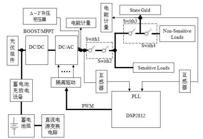 微網(wǎng)逆變器系統(tǒng)將可再生能源(如太陽能,風(fēng)能,水能,地?zé)崮?,生物質(zhì)能等)轉(zhuǎn)變?yōu)榕c電網(wǎng)同頻、同相的交流電,優(yōu)先輸送給當(dāng)?shù)刎?fù)荷供電,剩余的電能饋入電網(wǎng)。微網(wǎng)逆變器系統(tǒng)主要包括:光伏組件,蓄電池組,蓄電池充放電設(shè)備,DC/DC 變換器,微網(wǎng)逆變器,靜態(tài)開關(guān)等。
