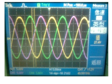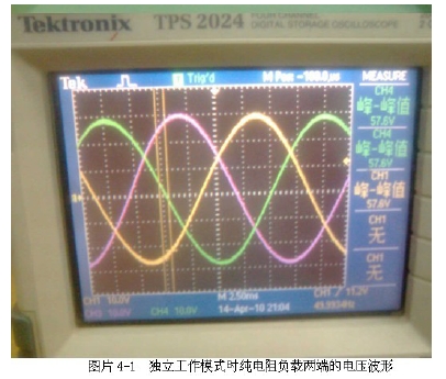 光伏并網(wǎng)發(fā)電系統(tǒng)要實(shí)現(xiàn)并網(wǎng),必須使逆變輸出與電網(wǎng)電壓的幅度、相位與頻率達(dá)到一致,否則將會使電網(wǎng)諧波增加、電能質(zhì)量下降,并產(chǎn)生并網(wǎng)環(huán)流,甚至造成光 伏發(fā)電系統(tǒng)的損壞。因此在并網(wǎng)過程中必須進(jìn)行同步鎖相控制、輸出電壓幅度控制以滿足并網(wǎng)的要求。根據(jù)IEEE Std 1547-2003 規(guī)定最大相位誤差為20 度,瞬時(shí)電壓誤差不能超過電網(wǎng)電壓的10%、最大頻率誤差不能超過0.3Hz。圖片4-1為獨(dú)立工作模式時(shí)純電阻負(fù)載兩端的電壓波形。