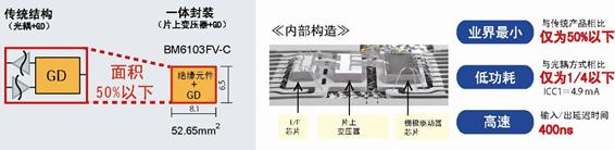 此次羅姆采用獨(dú)創(chuàng)的微細(xì)加工技術(shù),開發(fā)出片上變壓器工藝,進(jìn)而成功開發(fā)出小型并且內(nèi)置了絕緣元件的柵極驅(qū)動(dòng)器。無需外置零件,同時(shí)通過采用小型封裝,與傳統(tǒng)產(chǎn)品相比,安裝面積減少了約50%。不僅如此,由于內(nèi)置車載逆變器電路所需的全部保護(hù)功能,不僅有助于實(shí)現(xiàn)逆變器的小型化,還非常有助于減輕設(shè)計(jì)負(fù)擔(dān)。
