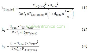 方程式計算得到最大輸入電壓和最小負(fù)載時 CCM 運行所需的最小電感。50% 占空比運行(VIN 等于 VOUT 時出現(xiàn))和統(tǒng)一效率條件下,比較這些方程式可知,方程式 1 中耦合電感的計算值是非耦合電感計算值的兩倍。由于轉(zhuǎn)換器肯定會有損耗,而大多數(shù)輸入電壓源均有很大不同,因此這種簡化了的電感泛化一般為錯誤的;但它通常足以應(yīng)付除極端情況以外的所有情況。它一般意味著,轉(zhuǎn)換器會比預(yù)期稍快一點進(jìn)入非連續(xù)導(dǎo)通模式 (DCM) 運行,其在大多數(shù)情況下仍然可以接受。如前所述,使用非耦合電感時,正如我們通常假設(shè)的那樣,無需輸出端電感的值與輸入端電感一樣;但是為了簡單起見肯定會這樣做。利用 VOUT/VIN 調(diào)節(jié)輸入端電感,便可確定輸出端電感值。使用更小值輸出端電感的好處是,它一般尺寸更小而且成本更低。
