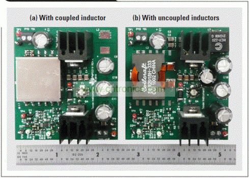圖 2 顯示了使用一個耦合電感的原型 SEPIC的 示意圖。若想在設(shè)計中實施非耦合電感,只需在相同 PWB 上用兩個電感替換耦合電感便可。圖 3 顯示了兩種原型電路。圖 3b 中,L1 占用了耦合電感的空間,而 L2 則位于右上角。