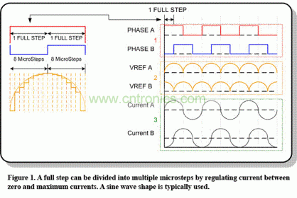 圖 1 通過調(diào)節(jié)零和最大電流之間的電流,我們可以將一個全步分成多個微步。一般會使用一個正弦波形。