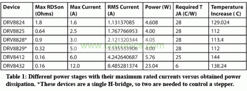 表 1 最大額定電流的不同功率級對比得到的功耗。這些器件均為單H橋,因此需要兩個來控制一個步進馬達。