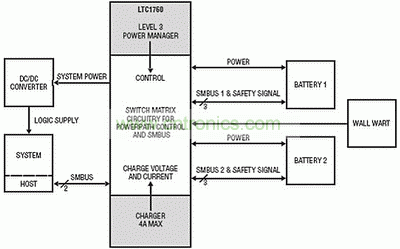 圖3 LTC1760雙電池充電器/選擇器系統(tǒng)架構