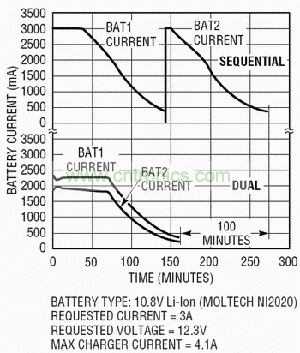 傳統(tǒng)上,雙電池系統(tǒng)是順序放電系統(tǒng),允許順序消耗電池電量(先消耗電池1,再消耗電池2),以簡單地延長總的電池工作時間。LTC1760采用了專有模擬控制技術,可允許安全地對兩個電池并行充電或放電。圖1是一個采用LTC1760的雙電池系統(tǒng)的簡化原理圖。這種結構使充電速度提高了50%,電池工作時間延長了10%。此外,并行放電不僅增強了電流能力,而且還降低了I2R損耗并改善了在極高負載條件下的電壓調節(jié)能力。降低I2R損耗和改善電壓調節(jié)都延長了時序解決方案的總放電時間(見圖2)。