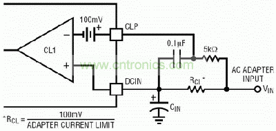 如圖4所示,這個電路限制充電電流以防止系統(tǒng)功率升高時交流適配器過載。要設定輸入電流限制,最重要的就是要最小化墻式配適器的額定電流。限流電阻可以通過下兩式來計算。