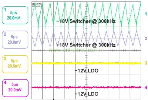 要?jiǎng)?chuàng)建這種參考設(shè)計(jì),需使用一個(gè)降-升壓結(jié)構(gòu)的 +60V 開關(guān)轉(zhuǎn)換器來產(chǎn)生一個(gè)平衡的+/-輸出電壓。利用低噪聲、高 PSRR LDO(例如:TPS7A30 和 TPS7A49 等),對(duì)開關(guān)的正負(fù)電壓輸出進(jìn)行后期穩(wěn)壓。圖 2 中,–18V 軌的開關(guān)穩(wěn)壓器電壓紋波為約 40mV,而 +18V 軌則為 20mV。通過使用 LDO 對(duì) 300 kHz 開關(guān)穩(wěn)壓器的輸出進(jìn)行后期穩(wěn)壓,電壓紋波得到極大減弱。這里,我們使用 60V 開關(guān)轉(zhuǎn)換器,因?yàn)榻拥匾_參考至 –18V 軌,并且最大 VIN為 30V。在這種配置中,開關(guān)轉(zhuǎn)換器必須承受的最大電壓為 48V。請(qǐng)為其寬輸入電壓、低輸出噪聲和高 PSRR 選擇 LDO。