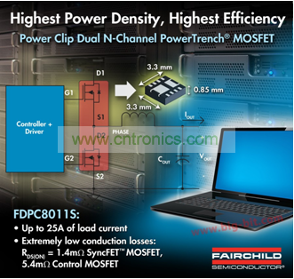 張瑞斌向記者介紹:“FDPC8011S專為更高的開關(guān)頻率的應(yīng)用而開發(fā),在一個采用全Clip封裝內(nèi)集成1.4m? SyncFETTM 技術(shù)和一個5.4m?控制MOSFET、低質(zhì)量因子的N溝道MOSFET,有助于減少同步降壓應(yīng)用中的電容數(shù)量并減小電感尺寸。該器件具有源極朝下和低側(cè)MOSFET可以實現(xiàn)簡單的布局和布線,提供更緊湊的線路板布局并獲得最佳的散熱性能。”FDPC8011S具有超過25A的輸出電流,與其它普通3x3mm2 雙MOSFET器件相比,輸出電流容量提高了2倍。