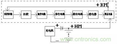 如圖2圖3示 ,合閘母線(+HM)經(jīng)過硅降壓回路降壓后,形成正控制母線(+KM),+KM經(jīng)自動(dòng)調(diào)壓回路采樣后,采樣值送到比較判斷回路,在此處進(jìn)行比較。如果+KM沒有高于預(yù)先設(shè)好的范圍,則觸發(fā)電路不動(dòng)作。移位執(zhí)行電路也不動(dòng)作,相應(yīng)的繼電器也不動(dòng),電路保持原狀態(tài),+KM值保持不變,如果+KM超出了預(yù)先設(shè)好的范圍,則比較判斷回路發(fā)出信號(hào),告之觸發(fā)電路,觸發(fā)電路立即發(fā)出脈沖,觸發(fā)移位寄存器,移位寄存器開始向左或向右執(zhí)行移位,從而使電路驅(qū)動(dòng)繼電器動(dòng)作。繼電器相應(yīng)的節(jié)點(diǎn)打開或閉和,來實(shí)現(xiàn)硅二極管是串入還是脫離+KM回路,于是實(shí)現(xiàn)+KM按電力標(biāo)準(zhǔn)規(guī)定的范圍內(nèi)變化,從而實(shí)現(xiàn)了自動(dòng)調(diào)節(jié)+KM電壓。
