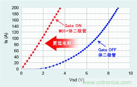 一般Si-IGBT元件無法逆向?qū)?,而SiC-MOSFET可通過體二極管實現(xiàn)常時逆向?qū)?。另外,通過輸入柵極信號,還可實現(xiàn)MOSFET的逆向?qū)?,與二極管相比,可實現(xiàn)更低電阻。通過這些逆向?qū)ㄌ匦裕c二極管整流方式相比,可在1000V以上的范圍采用高效同步整流方式的技術(shù)。