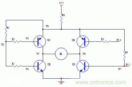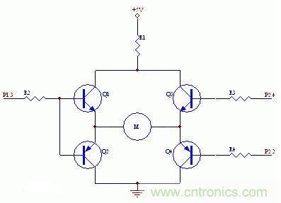 如下圖所示,些電路是作者最初設(shè)計(jì)的電路,P1.3、P2.2和P2.4分別是51單片機(jī)的IO引腳。設(shè)計(jì)的工作原理是:當(dāng)P1.3高電平、P2.2和P2.4都為低電平時(shí),電機(jī)正轉(zhuǎn)。此時(shí),Q1和Q4導(dǎo)通,Q2和Q3截止,電流注向?yàn)椋?VàR1àQ1àMàQ4;當(dāng)P1.3低電平、P2.2和P2.4都為高電平時(shí),電機(jī)反轉(zhuǎn)。此時(shí),Q2和Q3導(dǎo)通,Q1和Q4截止。P2.2為高電平同時(shí)P2.4為低電平時(shí),電路全不通,電機(jī)停止。圖中電阻:R1=20Ω,R2=R3=R4=510Ω