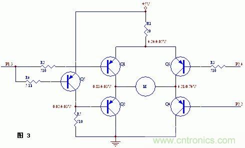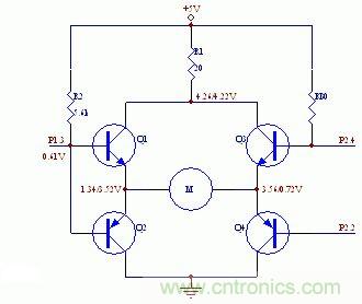但實(shí)際實(shí)驗(yàn)情況去出人意料,即電機(jī)正向和反向都不轉(zhuǎn)。經(jīng)測量,當(dāng)P1.3高電平,P2.2和P2.4都為低電平時(shí),Q4導(dǎo)通,但Q1不導(dǎo)通,P1.3的電平只有0.67V左右,這樣Q1無法導(dǎo)通。