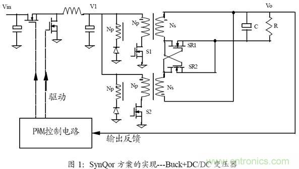 標(biāo)準(zhǔn)DC/DC 二次電源(半磚,1/4 磚)模塊,采用了Buck 與DC/DC 變壓器相級(jí)聯(lián)的兩級(jí)電路方案,如圖(1)所示。初初一看,這個(gè)方案比單級(jí)方案(如有源箝位正激電路)的元器件數(shù)要多,不太合理。但通過分析,可以發(fā)現(xiàn):其功率器件的總數(shù)并沒有增加(因?yàn)樵诘蛪捍箅娏鬏敵龅膽?yīng)用場(chǎng)合,輸出同步整流MOSFET 即使在單級(jí)方案中也要多個(gè)并聯(lián)才能實(shí)現(xiàn)效率指標(biāo));磁芯和電容元件的總面積也沒有增加(因?yàn)榭梢杂酶〉拇判竞碗娙荩?。但由于兩?jí)方案容易優(yōu)化和設(shè)計(jì),故模塊的電氣性能得到了極大的改善,具體分析見下面的介紹。