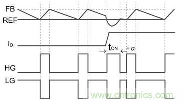 ●tON后HG一旦關(guān)斷,低邊MOSFET的柵極(LG)導(dǎo)通,F(xiàn)B引腳電壓開始下降,當(dāng)與REF電壓達(dá)到一致時(shí)關(guān)斷LG。