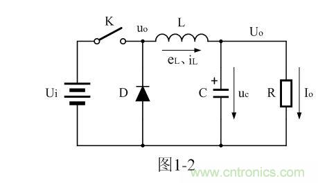 圖1-2中的C是儲(chǔ)能濾波電容,它的作用是在控制開關(guān)K接通期間Ton把流過儲(chǔ)能電感L的部分電流轉(zhuǎn)化成電荷進(jìn)行存儲(chǔ),然后在控制開關(guān)K關(guān)斷期間Toff把電荷轉(zhuǎn)化成電流繼續(xù)向負(fù)載R提供能量輸出,它對(duì)電感L的輸出電壓起到平滑濾波的作用,使輸出到負(fù)載兩端電壓的紋波降低。