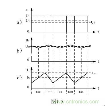 在此順便說明:由于電容兩端的電壓變化量ΔU相對(duì)于輸出電壓Uo來說非常小,為了簡(jiǎn)單,我們這里把Uo當(dāng)成常量來處理。在某種情況下,當(dāng)我們需要對(duì)電容的初次充、放電過程進(jìn)行分析時(shí),必須需要建立微分方程,并求解。當(dāng)開關(guān)電源剛開始工作時(shí),由于輸出電壓Uo的建立需要一定的時(shí)間,因此,輸出電壓Uo的建立也需要一個(gè)過渡過程,如對(duì)此過渡過程進(jìn)行精確計(jì)算,得出的結(jié)果中一般都含有一指數(shù)函數(shù)項(xiàng),當(dāng)令時(shí)間變量等于無窮大時(shí),即電路進(jìn)入穩(wěn)態(tài)時(shí),再對(duì)相關(guān)參量取平均值,其結(jié)果就基本與(1-4)相等。