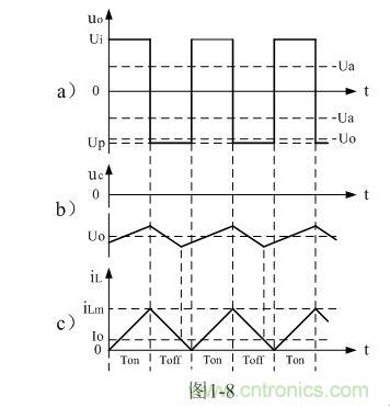 圖1-8、圖1-9、圖1-10分別是控制開關(guān)K的占空比D等于0.5、< 0.5、> 0.5時(shí),圖1-7電路中幾個(gè)關(guān)鍵點(diǎn)的電壓和電流波形。圖1-8-a)、圖1-9-a)、圖1-10-a)分別為控制開關(guān)K輸出電壓uo的波形;圖1-8-b)、圖1-9-b)、圖1-10-b)分別為儲能濾波電容兩端電壓uc的波形;圖1-8-c)、圖1-9-c)、圖1-10-c)分別為流過儲能電感L電流iL的波形。應(yīng)該特別注意的是,圖1-8-c)、圖1-9-c)、圖1-10-c)中的電流波形按原理應(yīng)該取負(fù)值,但取負(fù)值后反而覺得與前面圖1-5與圖1-6不好對比和分析,因此,當(dāng)進(jìn)行具體計(jì)算時(shí),一定要注意電流和電壓的方向。
