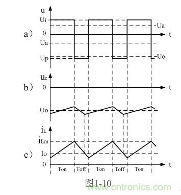 順便指出,反轉(zhuǎn)式串聯(lián)開關(guān)電源輸出電壓為負(fù)脈沖,當(dāng)圖1-7中的濾波電容器C開路時(shí),負(fù)脈沖的幅度將非常高,負(fù)脈沖是一個(gè)幅度按指數(shù)規(guī)律下降的尖脈沖,其幅度主要由負(fù)載電阻的大小,以及占空比來決定;當(dāng)圖7中的濾波電容器C接入后,反轉(zhuǎn)式串聯(lián)開關(guān)電源輸出電壓uo為一負(fù)方波,此方波我們可稱之為半波平均值,關(guān)于半波平均值的概念我們后面還會詳細(xì)解釋。