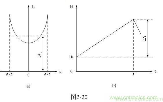 圖2-20-a和圖2-20-b分別是由(2-56)式給出的,鐵芯片中磁場(chǎng)強(qiáng)度按水平方向分布的函數(shù)H(x)和按時(shí)間分布的函數(shù)H(t)曲線圖。