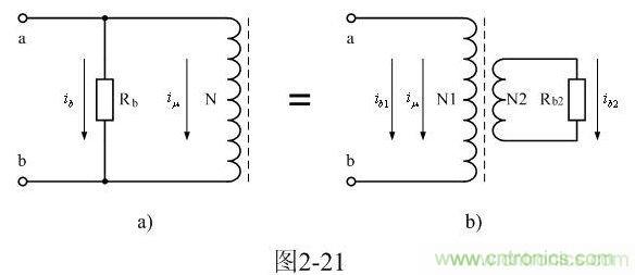 圖2-21-b是更形象地把渦流損耗等效成一個(gè)變壓器次級(jí)線圈N2給損耗電阻Rb2提供能量輸出,流過(guò)變壓器次級(jí)線圈N2的電流