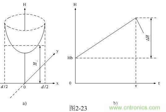 上面(2-65)式是表示圓柱體鐵芯截面沿x軸方向的磁場(chǎng)分布圖。其實(shí)磁場(chǎng)分布在整個(gè)鐵芯截面的xy平面內(nèi)都是以中心對(duì)稱的。這樣圓柱形變壓器鐵芯中的磁場(chǎng)強(qiáng)度在xy平面的分布函數(shù)H(x,y)曲面,就相當(dāng)于把圖2-20-a的函數(shù)曲線,以中心為圓心旋轉(zhuǎn)一周而得到的新圖形。